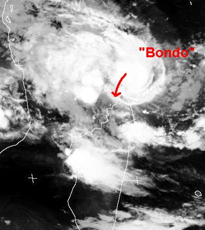 Der Zyklon 'Bondo' nördlich von Madagaskar hat sich etwas abgeschwächt, und erreicht jetzt nur noch mittleren Windgeschwindigkeiten von 157, in Böen 195km/h. Dabei zieht er in südwestlicher Richtung auf den Nordteil von Madagaskar zu. Sein Endziel ist allerdings noch unklar. (Bildquelle: NERC Satellite Receiving Station, Dundee University, Scotland, http://www.sat.dundee.ac.uk/)