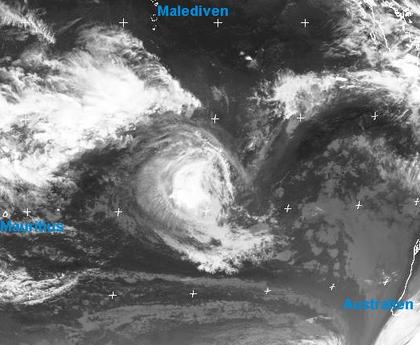 Der Zyklon 'Carina' liegt mitten auf dem Indischen Ozean, weit entfernt vom Festland. Er hat zurzeit eine mittlere Windgeschwindigkeit von 210 km/h und Böen bis 260 km/h. Er wird sich jedoch weiter abschwächen.