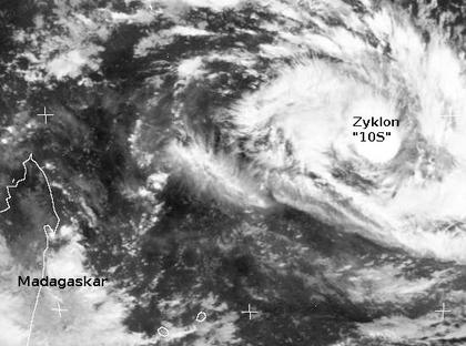 Derzeit befindet sich ein Zyklon mit der Bezeichnung '10S' mitten im Indischen Ozean. Momentan erreicht er Spitzenwindgeschwindigkeiten bis zu 120 km/h, wird sich auf seinem berechneten Weg nach Süden noch verstärken.