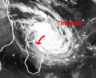 Der Zyklon 'Indlala' hat die Nordostküste von Madagaskar erreicht und zieht nun weiter ins Landesinnere. Zurzeit erreicht er mittlere Windgeschwindigkeiten von 195 km/h, in Böen 240 km/h, im Landesinneren schwächt er sich jedoch wieder ab. Neben dem Sturm kommt es auf Madagaskar auch zu sehr kräftigen Regenfällen. (Bildquelle: NERC Satellite Receiving Station, Dundee University, Scotland, http://www.sat.dundee.ac.uk/)