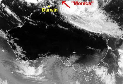 Der Zyklon 'Monica' befindet sich zur Zeit im Carpentaria Golf im Nordosten Australiens. Zur Zeit erreicht er Windgeschwindigkeiten von 165, in Böen 205 km/h und zieht Richtung Nordwest. Berechnungen zufolge soll er sich noch weiter verstärken und nördlich an Arnhem Land vorbeiziehen. Sein Endziel ist allerdings noch unklar.