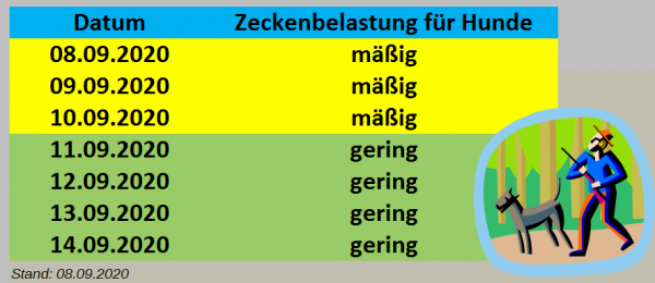 Vor allem die raren Niederschläge und die nicht mehr ganz so milden Nächte wirken sich schädlich auf den Zeckenbesatz im Unterholz aus. Für diese Jahreszeit ist in den kommenden Tagen nur selten mit erhöhten Zeckenwerten zu rechnen.