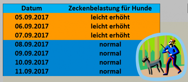 Die kühleren Temperaturen im Wochenverlauf sorgen zumindest für eine kleine Entspannung bei den Hundezecken - trotz zeitweiliger Niederschläge und einer somit hohen Feuchte im Unterholz. Wer auf Nummer Sicher gehen möchte, sollte beim Spaziergang durch Wälder und Wiesen trotzdem noch die Zeckenzange mit sich tragen.
