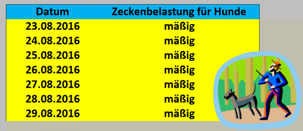 Selbst in den besonders risikoreichen Zeckenregionen im Südwesten des Landes sind in den nächsten Tagen nur höchstens mäßige Konzentrationen zu verzeichnen. Dem weitgehend sorglosen Spaziergang mit  Ihrem Vierbeiner steht in dieser Woche also nicht viel im Weg!