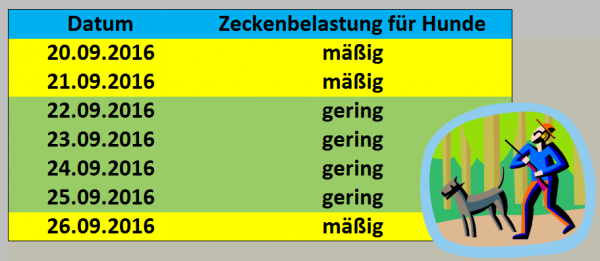 Trockenheit und kühle Nächte wirken sich in den kommenden Tagen schädlich auf den Zeckenbesatz aus. Im Unterholz ist bei den Hundezecken bis geringen bis mäßigen Belastungen zu rechnen.