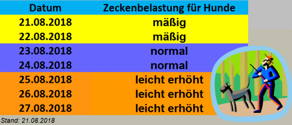 Ein leichten Abgang der Zeckenebalastung für Hund als auch für uns Menschen gab es hinsichtlich der letzter Woche. Da die Temperaturen in dieser Woche auch mal deutlich unter die 30 Grad C Marke fallen können besteht nur meist mäßiges bis normales Risiko. Doch zum Wochenende kommen wieder vermehrt Schauer ins Land und somit auch eine höhere Belastung der Zecken.