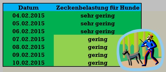 Die Temperaturen liegen nachts um oder unter 0 Grad C. Zecken sind zu jetzigen Zeitpunkt noch nicht aktiv; das könnte sich aber nächste Woche mit höheren Temperaturen ändern. Eine "starke Aktivität" ist dann schon zur Monatsmitte möglich.