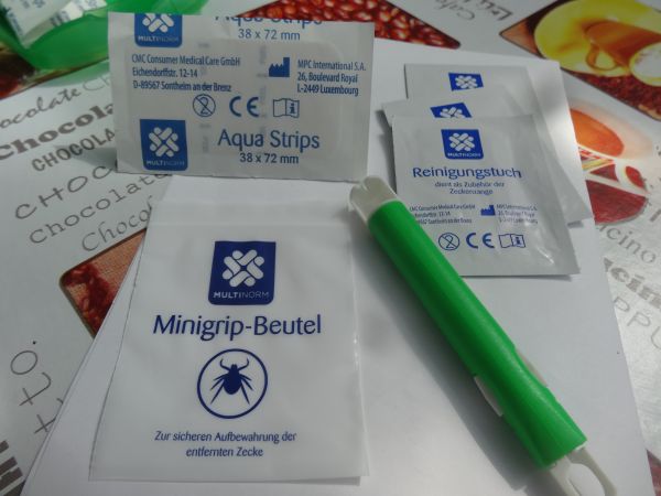 Neben einer Zeckenzange enthält unser Beispielset fünf Pflaster in unterschiedlichen Größen, zwei Reinigungstücher sowie ein kleines Tütchen, in welchem die entfernte Zecke sicher aufbewahrt und gegebenenfalls zur labortechnischen Untersuchung weitergegeben werden kann.