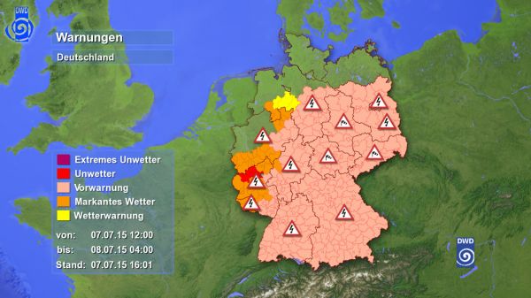 Erste Gewitter haben das Saarland, Rheinland-Pfalz und NRW erreicht. In den nächsten Stunden werden weitere Gewitter sich bilden. Auch Unwetterwarnungen wurden hier für Rheinland-Pfalz herausgegeben.