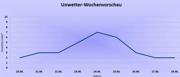 Die neue Wetterwoche startet in der Bundesrepublik mit nur geringen Wetterrisiken, dabei ist es am Montag noch oft sehr freundlich und trocken, wobei im weiteren Verlauf von Westen Tiefausläufer mit zeitweiligem Regen durchziehen. Etwa ab Donnerstag steigen die Temperaturen auf teils heiße Werte von 30 Grad und mehr und einhergehend steigt auch das Gewitterrisiko in weiten Landesteilen spürbar an. Ab Sonntag sollte das Unwetterrisiko nach dem jetztigen Stand wieder auf ein niedriges Level zurückgehen.