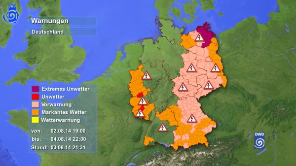 Weiterhin ziehen Gewitter durch das Land, teilweise sind sie unwetterartig-stark. Für weiter Teile Mecklenburg-Vorpommerns bestehen sogar Unwetterwarnungen vor extremem Unwetter. Hier bringen die Gewitter neben Hagel und Sturmböen auch extrem große Regenmengen in kurzer Zeit.