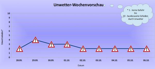 Die Gefahren durch Unwetter bleiben in der nächsten Woche in Deutschland weitgehend gering. Dabei herrscht verbeitet ruhiges und auch überwiegend trockenes Frühherbstwetter. Am Dienstag weht jedoch vor allem über der Südhälfte des Landes ein oft frischer Wind.
