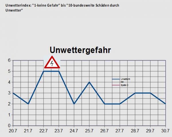 Die Gefahren durch Unwetter bzw. Gewitter sind in der nächsten Woche größtenteils leicht, besonders am Mittwoch und Donnerstag zeigt sich jedoch eine meist mäßige und regional auch starke Gewitterneigung, dabei sind vor allem im Süden und Osten teils auch schwere Gewitter möglich.