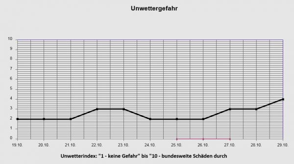 Die Gefahren durch mögliche Unwetter sind in der kommenden Woche nur gering. Bei überwiegend ruhigem, oft trüben, zeitweise nassem und eher mildem Herbstwetter sind nur regional leichte Nachtfröste möglich, dabei besteht die Gefahr von überfrierender Nässe oder Rauhreif. Zumeist bleiben die Nächte aber frostfrei.
