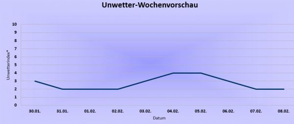 Die Unwettergefahr bleibt in der nächsten Woche voraussichtlich auf einem eher niedrigen Niveau. Es deutet sich eine wechselhafte Witterungsphase an, bei der feuchtmilde Luft von Südwesten und Westen nach Deutschland gelenkt wird. Dabei fällt nur noch in den höchsten Lagen Schnee und im Flachland bleibt es sogar nachst oft frostfrei. Samstag und Sonntag deutet sich ein stürmischer Ausläufer für die Nordsee an, dabei kann es auch im übrigen Norden und Westen teils windig werden.