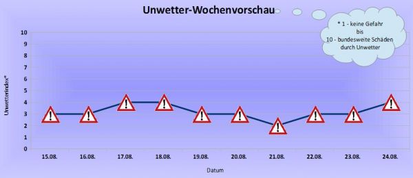 In der kommenden Wetterwoche zeigen die Modelle für das Unwetterrisiko im Durchschnitt meist ein leichtes bis mäßiges Risiko:
