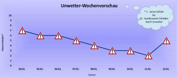 In der neuen Woche bestehen besonders zum Wochenstart oft wetterbedingte Risiken, denn von Südwesten her aufkommenden Tiefausläufer bringen besonders über der Nordosthälfte des Landes verbreiten und teils kräftigen Schneefall, dabei besteht erhöhte Glättegefahr! Auch am Dienstag und Mittwoch herrschen über dem Norden und Osten noch weitgehend winterliche Bedingungen mit Schnee, Schneeregen oder auch gefrierendem Regen! Am Donnerstag fällt gebietsweise weiterer Schnee, wobei es insgesamt etwas milder wird und die Schneefälle meist in Regen übergehen. Zum Wochenende fällt nur noch selten Schnee. Im Nordseeumfeld ist es im Wochenverlauf immer wieder stürmisch und zeitweise herrscht auch Sturm. Sonst weht der Wind meist mäßig bis frisch, im Norden zeitweise stark.