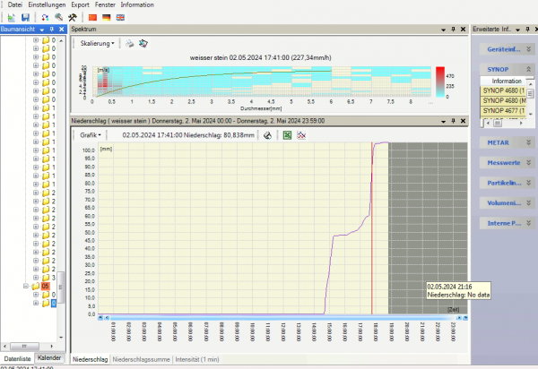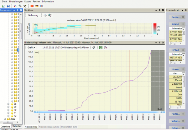 Bis 19 Uhr verzeichneten wir so bereits 100 l/m² Regen mit dem Laser-Distrometer von Thies. Das LANUV NRW konnte mit seiner Station zu diesem Zeitpunkt ebenfalls schon über 80 l/m² Regen messen.