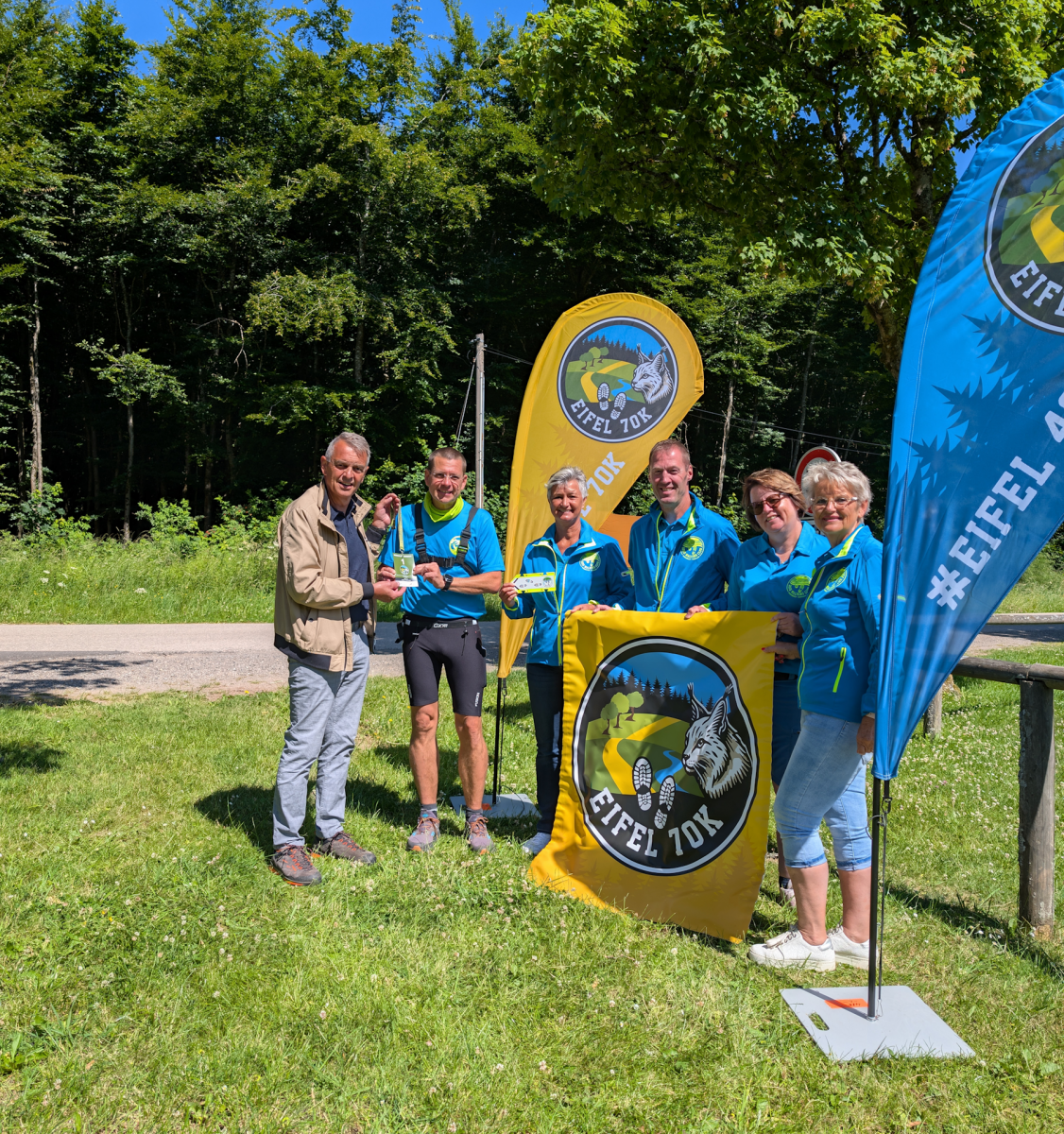 Mit dabei war auch der Bürgermeister der Gemeinde Hellenthal, Rudolf Westerburg. Er überreichte Karsten Brandt von donnerwetter.de, der auch am "Marsch mit Aussicht" teilnehmen wird, symbolisch die Startnummer "1".