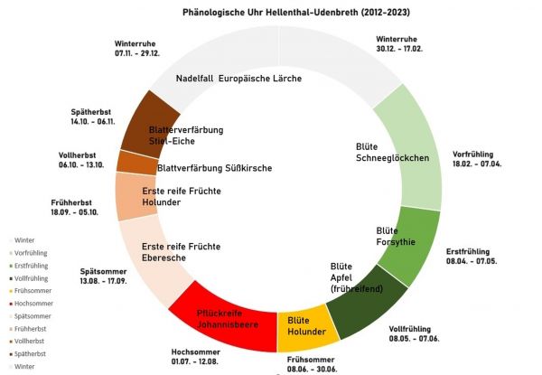 Die Grafik zeigt die phänologische Uhr für den Beobachtungszeitraum 2012 bis 2023. Mit den phänologischen Jahreszeiten sind die beobachteten Eintrittsphasen sowie die mittlere Jahreszeitdauer vermerkt.