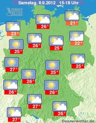 Vor allem in Süddeutschland scheint am Samstag schon oft die Sonne fast ungestört, die Temperaturen erreichen meist um 23 bis 25 Grad, im Rhein-Main-Gebiet auch über 26 Grad.