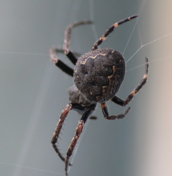 Diese weibliche Spaltenkreuzspinne hat in ihrem Netz eine Wanze gefangen und in ihre Fäden eingewickelt. Diese Spinnenart findet sich in fast jedem deutschen Garten. Bei diesem schönen und trockenen Wetter verfangen sich auch reichlich Opfer in ihrem großem Netz.