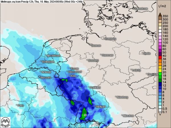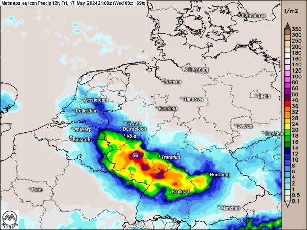 In Baden-Württemberg und Rheinland-Pfalz können laut ICON-Modell am Donnerstag und Freitag jeweils Regenmengen von 50 bis 70 l/m² niedergehen. Solche Mengen können lokal für Überschwemmungen und volle Keller sorgen.