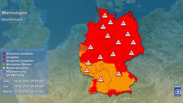 Aktuelle Unwetterwarnlage (Stand: 17.02.2022, 06.52 Uhr)