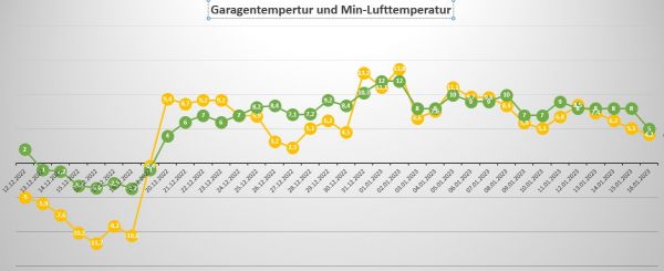 In dieser Grafik ist die Minimaltemperatur der Garage grün, die Minimaltemperatur draußen gelb dargestellt.