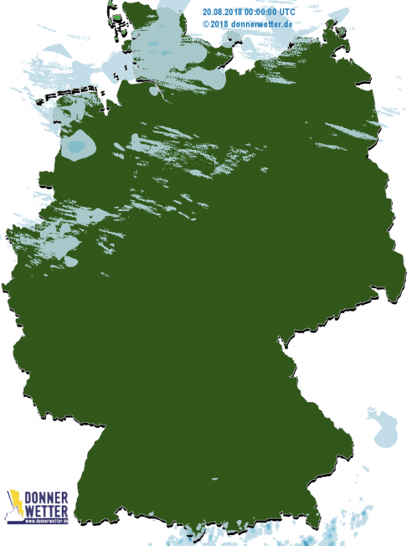 Heute fällt im Westen und in den Mittelgebirgen aus dichterer Bewölkung stellenweise etwas Regen, oder es gehen schwache Schauer nieder. Die Niederschlagsmengen dürften jedoch bis auf wenige Ausnahmen nur gering ausfallen. Im südlichen Schwarzwald und an den Alpen sind vereinzelte Gewittergüsse nicht ausgeschlossen. Sonst bleibt es jedoch niederschlagsfrei.