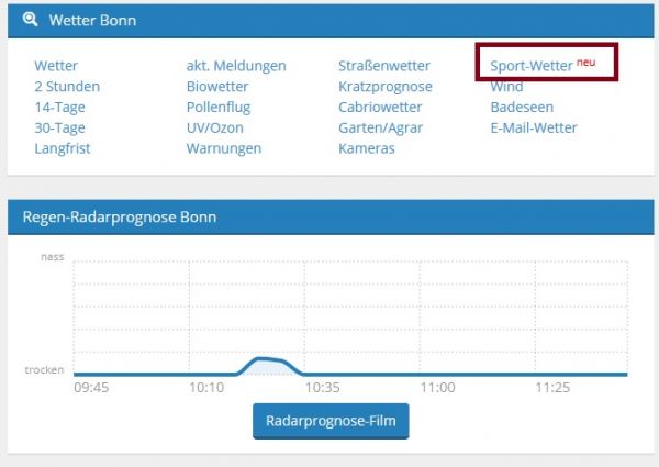 Das Sport-Wetter für Eure Stadt findet Ihr nach Postleitzahleingabe oben rechts - weitere Informationen zu unserem Sport-Wetter findet Ihr hier!