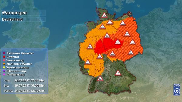Vor allem von Brandenburg, über Sachsen-Anhalt, Niedersachsen bis in den Osten Nordrhein-Westfalens und in den Norden Hessens regnet es am Dienstag und Mittwoch immer wieder und lang anhaltend, so dass verbreitet etwa 50 Liter pro Quadratmeter zusammen kommen können. Insbesondere im Nordstau der Berge, zum Beispiel im Süden Niedersachsens, sind auch 100 Liter pro Quadratmeter möglich.
