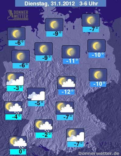 In der Nacht zum Mittwoch und zum Donnerstag werden die Temperaturen noch weiter sinken, so dass dann auch im Westen verbreitet unter -10 Grad C. gemessen werden.
