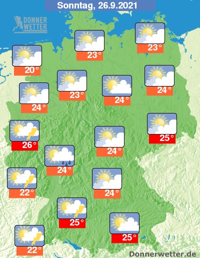 Von Südwesten her nähert sich im Tagesverlauf dagegen feuchtere Luft, gebietsweise steigt das Schauer- und Gewitterrisiko. Lokal könnte der Weg zu Wahlurne dann möglicherweise auch von Starkregen begleitet werden. Sehr mild bleiben die Temperaturen: In Küstennähe werden am Sonntag immerhin noch Werte um 20 bis 23 Grad erreicht, im Westen und Südwesten gibt es mit 25/26 Grad nochmals einen Sommertag.