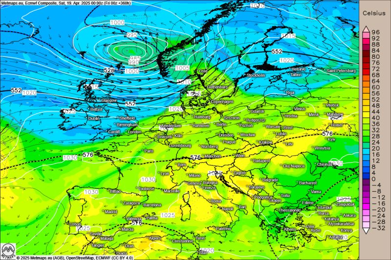 Europalage mit Luftdruck und Wind zum 19.4.