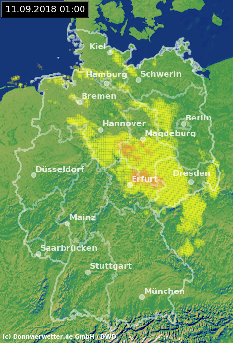 Am Donnerstag erreicht eine schwache Kaltfront auch die mittleren und südlichen Landesteile in Form örtlicher Regengüsse und einzelner Gewitter. Die Niederschlagsmengen liegen auch hier allgemein zwischen 1 und 10 Liter pro Quadratmeter, in kräftigeren Schauern auch mehr.