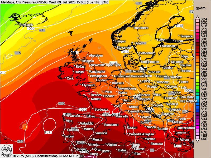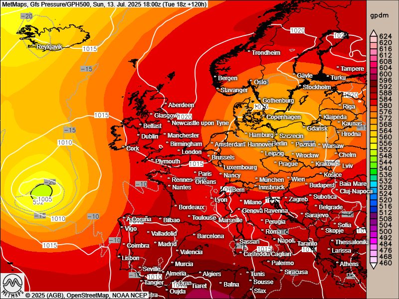 Die Hochdruckzone über Westeuropa trennt die Westwindzone bis nach Skandinavien auf, was für ein "eingefahrenes Wettermuster" über einen längeren Zeitraum spricht.