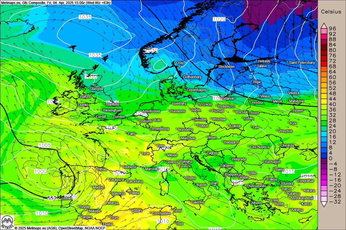 Nachfolgend seht Ihr die Temperaturanomalie und die Höchsttemperaturen am Freitag nach GFS, zudem die Lage des Hochs am Freitag.