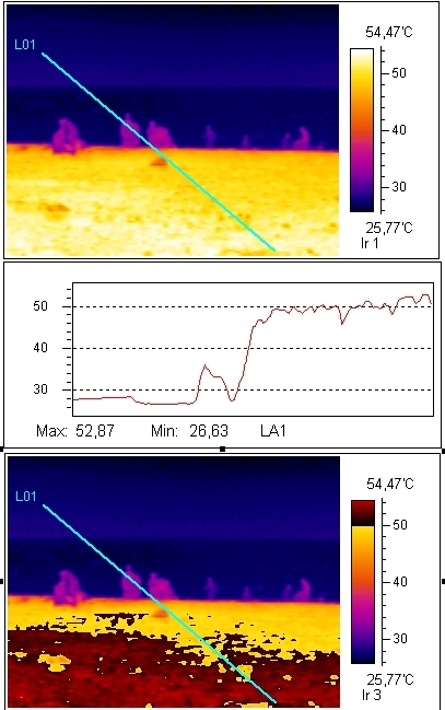 So erhitzen sich auch die Sandstrände in den nächsten Tagen auf rekordverdächtiges Niveau, wie hier auf unserem Infrarotbild. Hier glühen bei Temperaturen von knapp 55 °C bereits ordentlich die Sohlen!