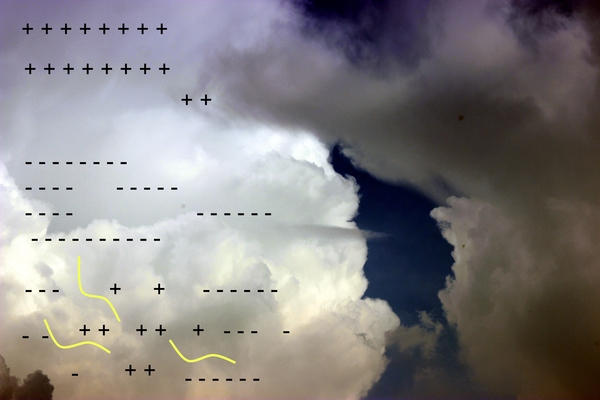 In der Wolke kommt es durch starke Aufwinde und durch Hagel- und Graupelbildung zur Ladungstrennung. In der Höhe finden sich positive Eisteilchen, unten in der Wolke positive und negative Ladungen, die dann bei entsprechend großer Ladungstrennung zur Entladung eines Blitzes führen. Die Gewitter sorgen forgen für den Ladungstransport von positiven Ladungen in die Höhe und somit für die Aufrechterhaltung des elektrischen Feldes.