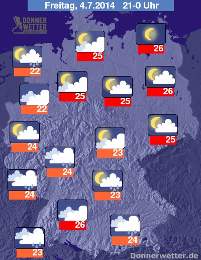 Vor allem in der Süd- und Westhälfte schauert es lokal während den Fußballfeiern. Trocken durch den Abend kommt man am ehesten im Nordosten Deutschlands. Allein die Temperaturen sind weltmeisterlich: Um 22 bis 26 Grad.