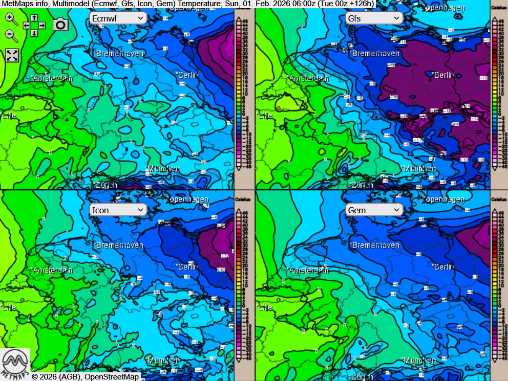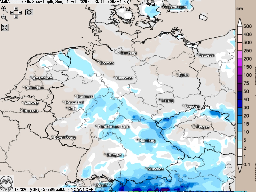 Die Frühwerte am 01.02. in der Multimodellprognose und die Temperaturabweichung sowie die Schneehöhe (01.02., 09:00 Uhr) nach GFS: