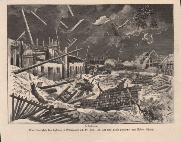 Vor weit über 100 Jahren wurde diese Zeichnung eines Tornados in Oberbayern in einer Zeitung veröffentlicht. Ganze Bäume fliegen hier auf dem Bild mit Wurzeln durch die Luft, ganze Häuser werden samt Mauerwerk zerstört. Ca. 20-30 Tornados/WIndhosen, neueste Zahlen gehen von 40 aus, sind pro Jahr zu erwarten und sie sind kein "modernes" Phänomen, wie wir sehen.