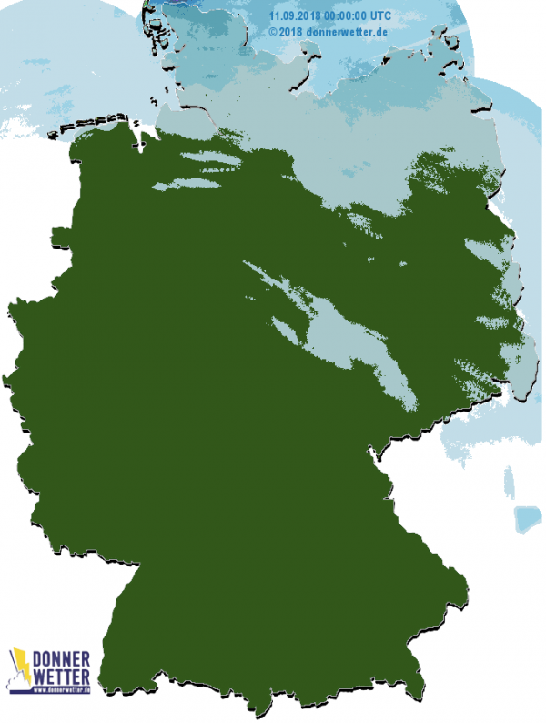 Am Donnerstag erreicht die schwache Kaltfront auch die mittleren und südlichen Landesteile in Form örtlicher Regengüsse und einzelner Gewitter. Die Niederschlagsmengen liegen dabei allgemein zwischen 1 und 10 Liter pro Quadratmeter, in kräftigeren Schauern auch darüber. Im nördlichen Schleswig-Holstein kann es gelegentlich etwas regnen.