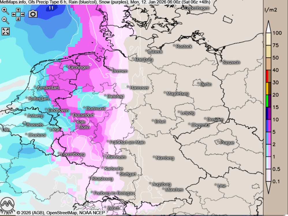 Die Wetterkarte für 03:00 Uhr sowie die Regen- / Schneekarte für Montagfrüh (06:00) nach GFS/ICON: