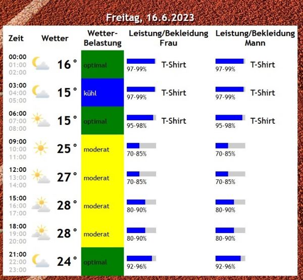 Neben den zu erwartenden Temperaturen und Wettersymbolen gibt es eine Einschätzung der thermischen Belastung für Läufer durch WGBT. Dieser Wert wird vom amerikanischen Militär benutzt, um Belastungen für die Soldaten abzuschätzen. Zeigt der Index „gelb“ an besteht bereits eine Hitzebelastung, bei „orange“ müssen Läufer schon mit einer hohen, bei „rot“ sogar mit einer deutlich erhöhten Hitzebelastung rechnen. Darüber hinaus unterscheidet das Laufwetter unter den Geschlechtern, gibt eine Einschätzung der Leistung sowie der passenden Kleidung für einen Lauf von fünf bis 20 Kilometer.