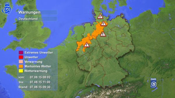 Aktuell bestehen nur für den Nordwesten Deutschland Warnungen des DWD vor "Markantem Wetter" (keine Unwetterwarnung).