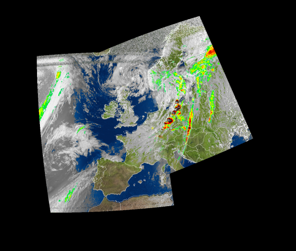 Heftige Gewitter toben bis Mitternacht noch in Franken. Die Gewitter werden aber nun zunehmend schwächer und lösen sich auf. Auf unserem Satellitenbild sind die Gewittertürme farblich schön zu sehen.