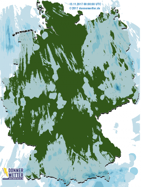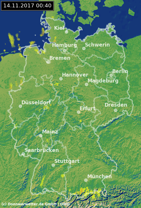 Das Radarbild zeigt aktuell einige kleinräumige Niederschlagssignale. Je nach Temperatur und Höhenlage fällt dabei etwas Regen oder Schnee. Sonst ist der Himmel über Deutschland teils bewölkt, teils sternenklar. Stellenweise haben sich Nebelfelder gebildet. Die Temperaturen liegen aktuell zwischen -3 und 6 Grad im Binnenland, sowie 8 Grad auf den Nordseeinseln. Verbreitet hat sich Reif gebildet. Achtung Glätte.