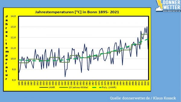 Unsere Grafik zeigt exemplarisch die Entwicklung der durchschnittlichen Jahresmitteltemperatur im Zeitraum 1895 bis 2021 an einer Wetterstation im Rheinland.